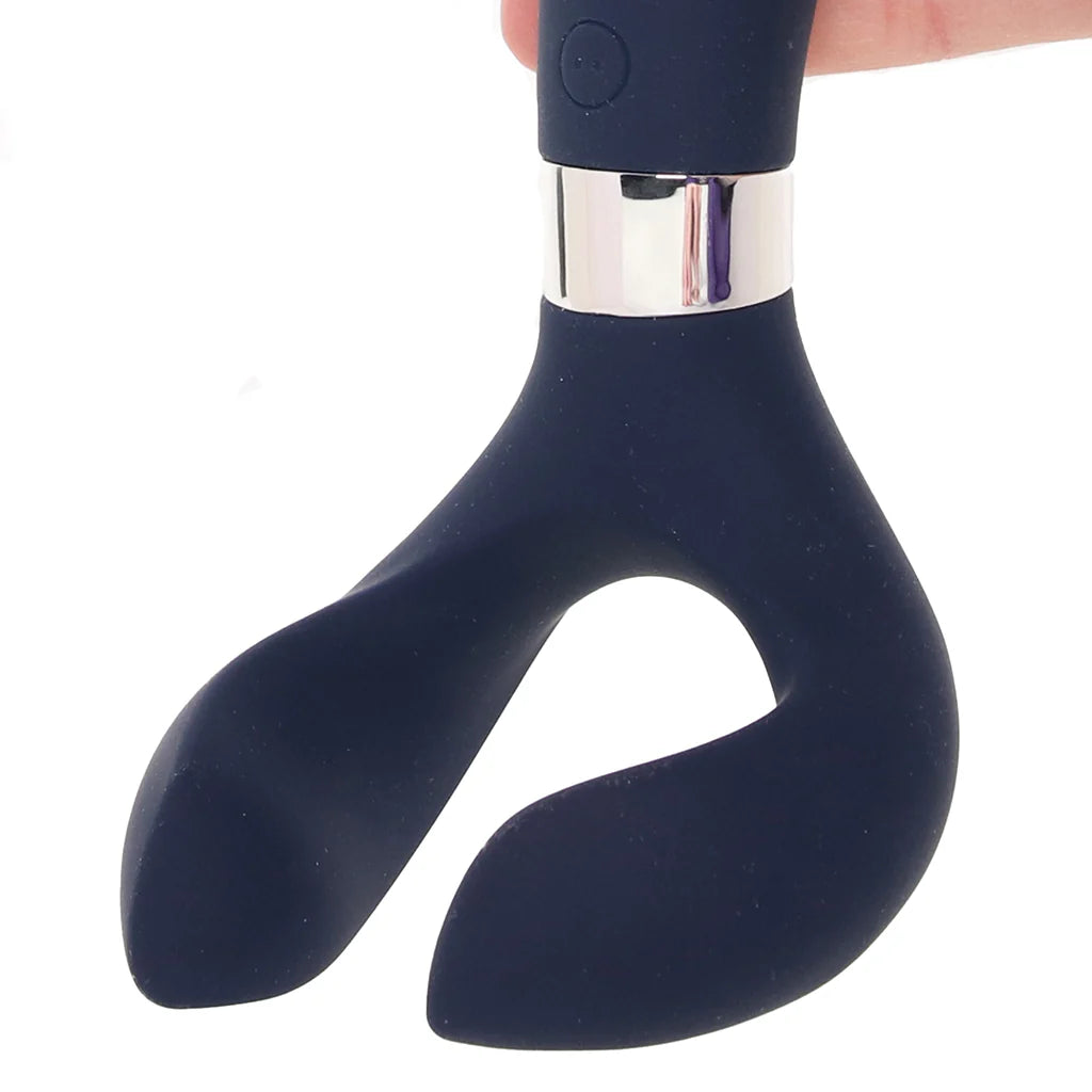 Two flexible, rotating silicone stems extend from one side, while a curved, deep-diving shaft sits on the other. The stems can be rotated forward, backward, or to the side to adapt to different positions and bodies. Press them together to surround nipples, the clitoris, penis, or scrotum, loop them over the shaft for wearable play, or guide them by hand for targeted stimulation.